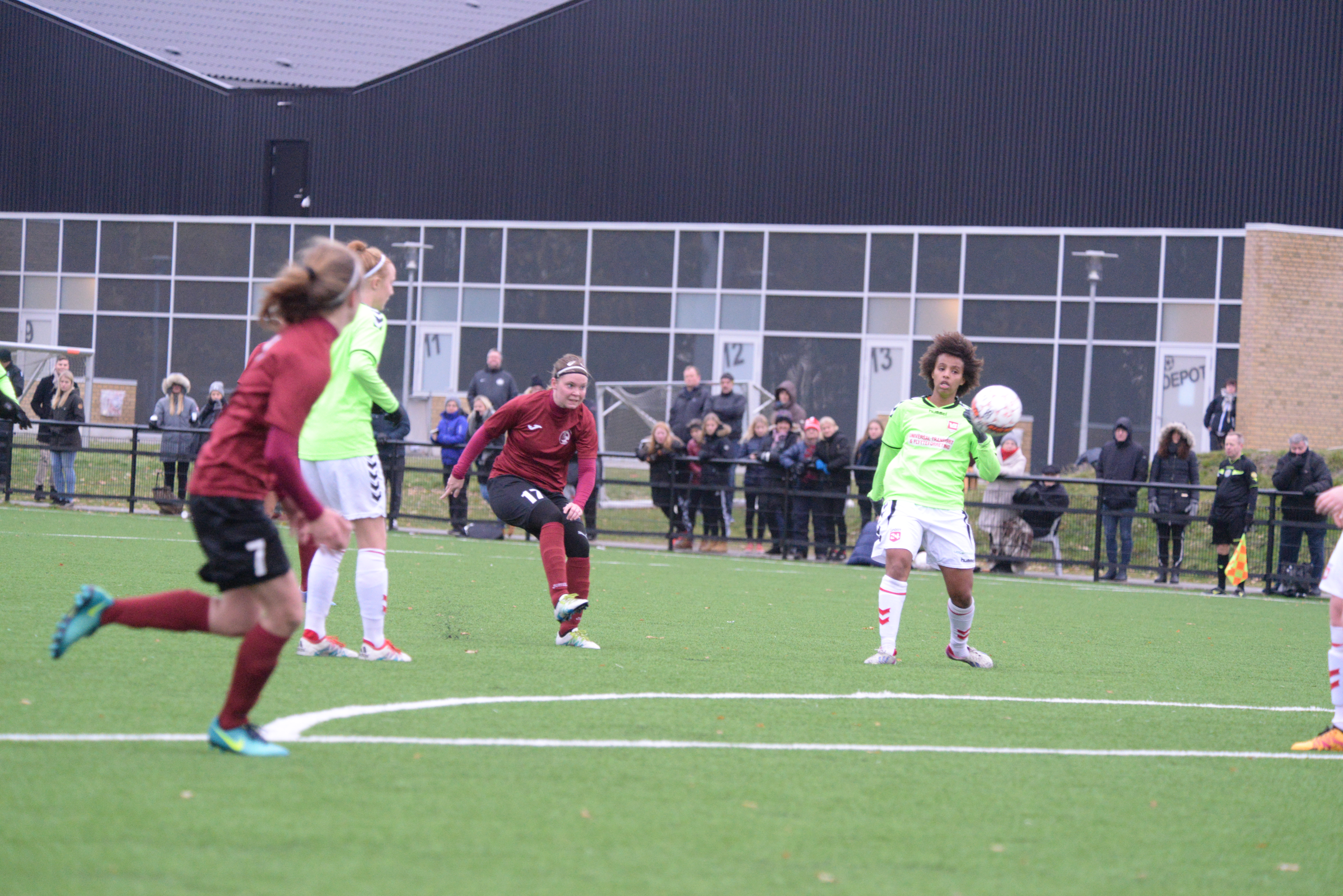 Der var dømt dødvande i kampens indledende fase. Begge hold virkede en smule anspændte, og der var derfor heller ikke mange flotte spilsekvenser at skrive hjem om fra kampens start. I stedet blev det til en række lange bolde begge veje, som ikke voldte nævneværdige problemer for de to bagkæder. Den uskønne start tog dog lidt af et afbræk, da Vejle efter 15 minutters spil fik fremprovokeret et hjørnespark i værternes venstreside. Et farligt indlæg ramte ind mellem venner og fjender i det odenseanske straffesparksfelt, og da ingen parter for alvor vandt hovedstødsduellen, dumpede bolden ned foran Amalie Thestrup, som med en kølig afslutning bragte Vejle på vinderkurs. Det var et mere initiativrigt hjemmehold, der forsøgte at reagere på føringsmålet, men de ellers veletablerede angreb manglende den sidste gnist. Vi skulle derfor helt frem til 32. minut, før det rigtigt brændte på i udeholdets straffesparksfelt. Emilie Henriksen, der var blandt Odense Q’s bedste i første halvleg, opfangede et indlæg fra Maria Møller Thomsen bagerst i feltet, og fra en spids vinkel sendte hun en afslutning afsted, men Vejle-keeperen gjorde sig bred og fik blokeret til hjørnespark. Henimod slutningen af første halvleg genoptog kampen det rodede mønster fra tidligere, og trods stor ivrighed fra hjemmeholdet var der langt mellem truslerne mod vejlensernes mål. Derfor gik holdene til pause ved stillingen 0-1 oven på 45 relativt uskønne spilminutter i den fynske regn og blæst.