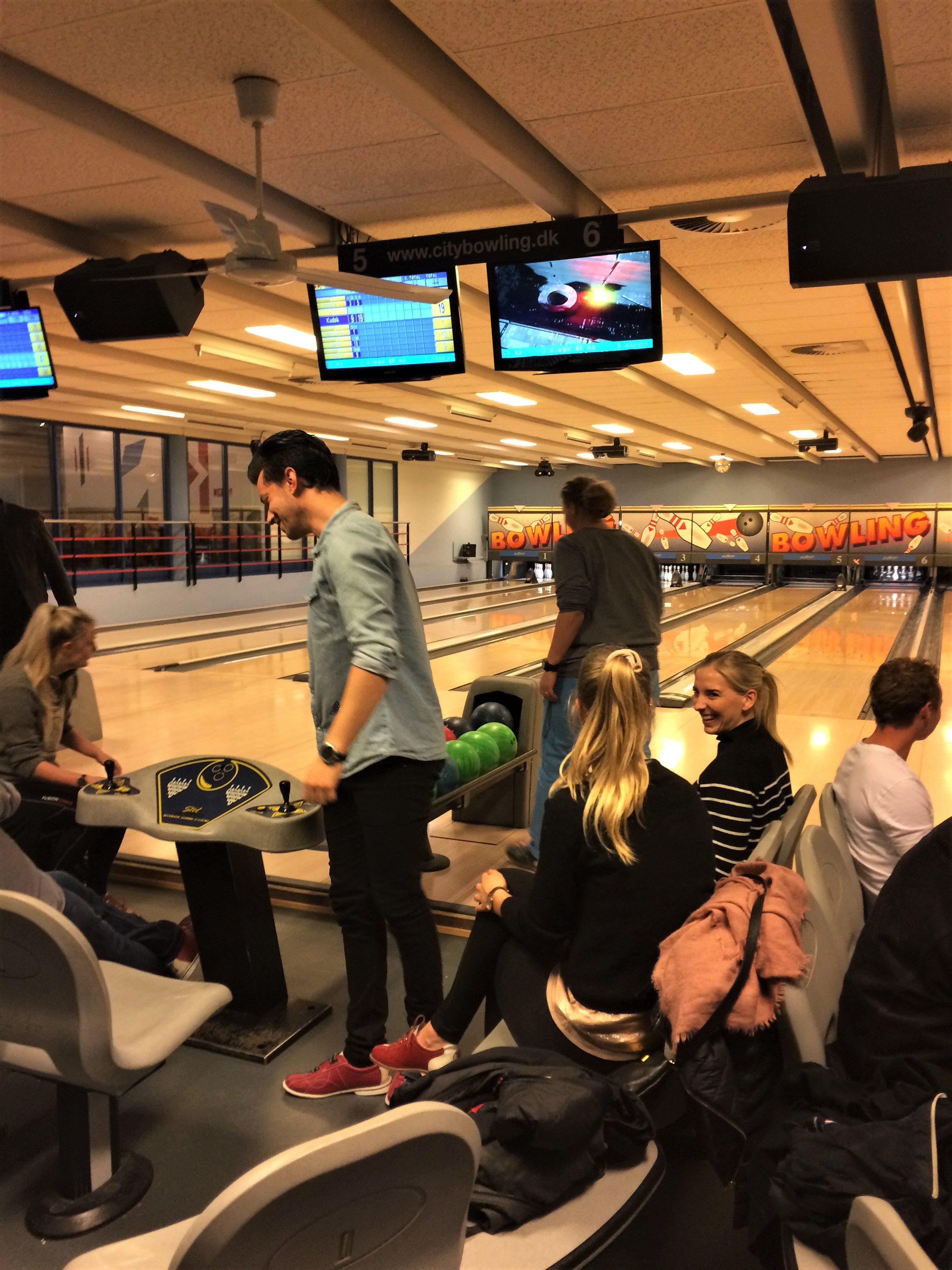 Da burgerne var spist, satte vi kursen mod City Bowling på Rugårdsvej. Her havde trænerteamet booket fem baner, og sat en lille konkurrence i gang til gavn for holdets bødekasse: banen med den laveste gennemsnitlige score pr. spiller skulle give det største bidrag til bødekassen, og kun banen med den højeste gik helt fri. Iført bowlingsportens moderigtige fodtøj trillede spillere og trænere løs i en god times tid, inden den endelige slutstilling var klar: