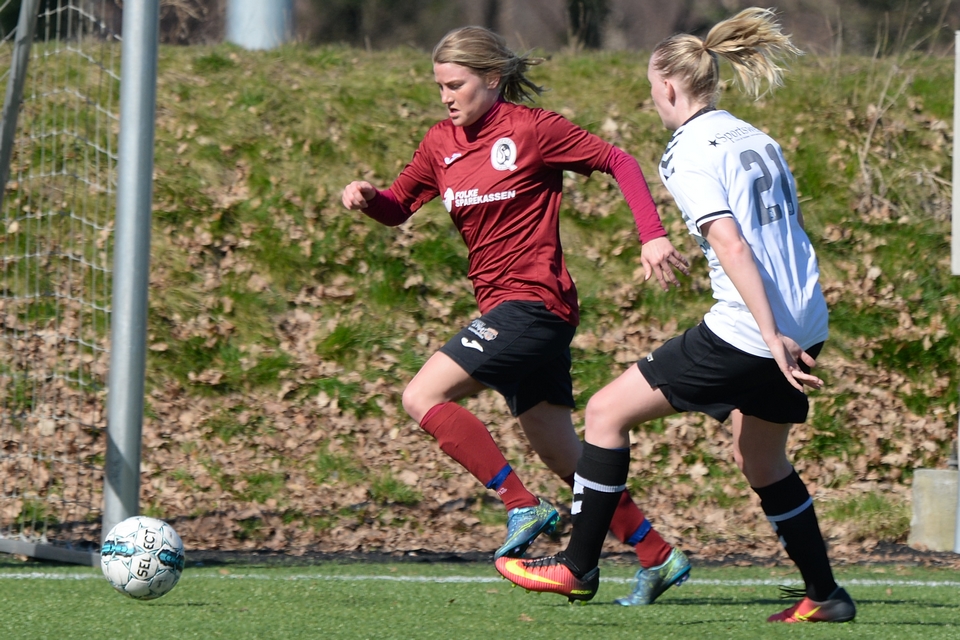Kampen startede i et højt tempo – godt hjulpet på vej af et højt pres fra især udeholdets to forreste kæder. Allerede efter 4 minutters spil åbnede Odense Q scoringen, da Line Munk - fra 20-25 meters afstand - tordnede et frispark op i fjerneste målhjørne.