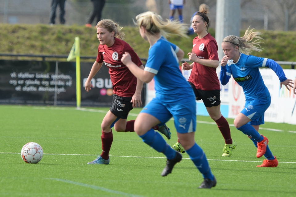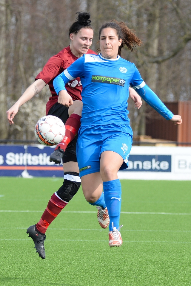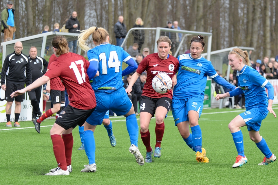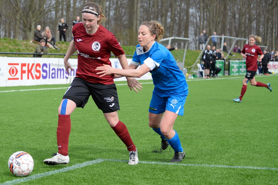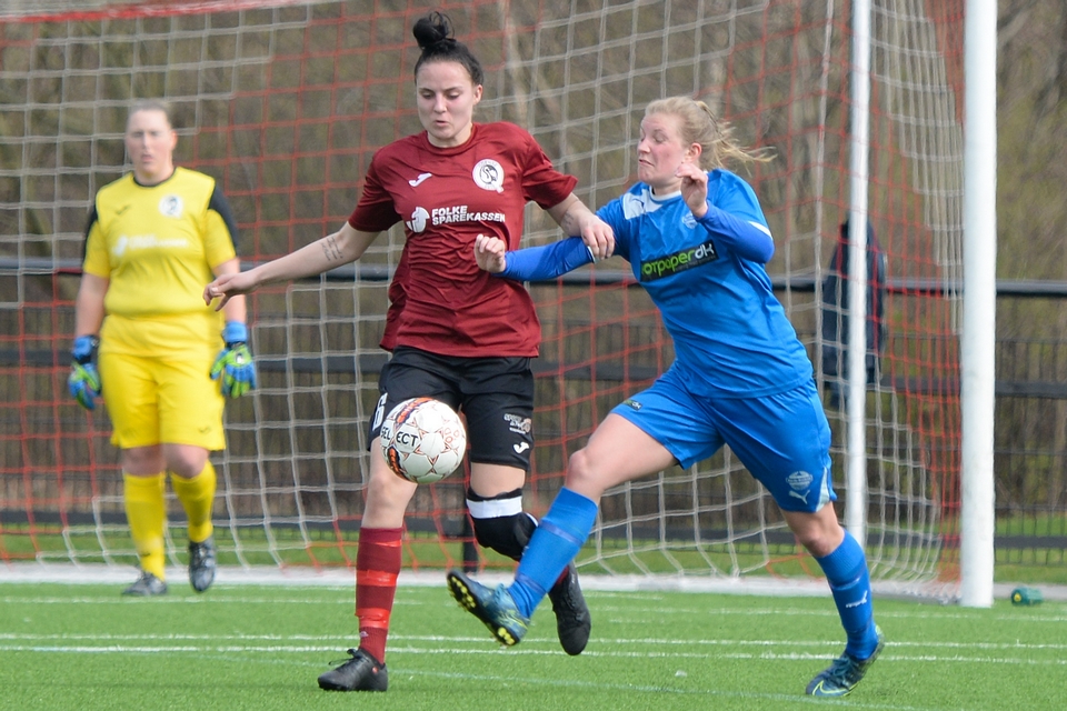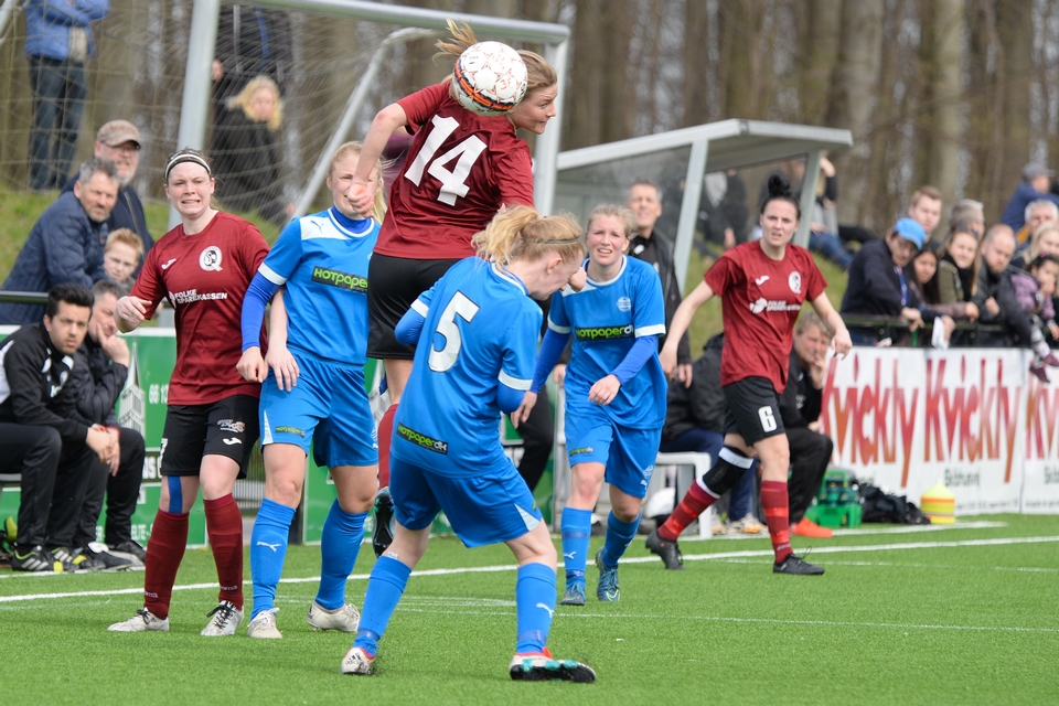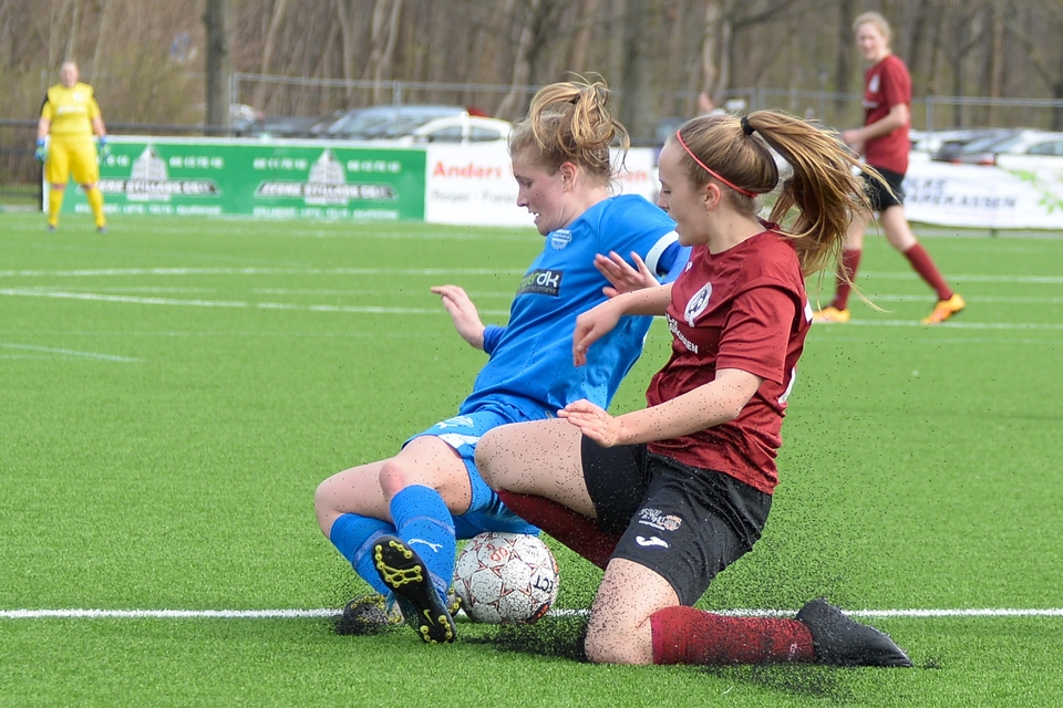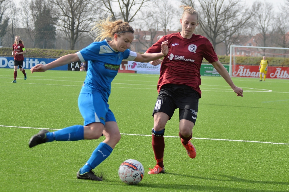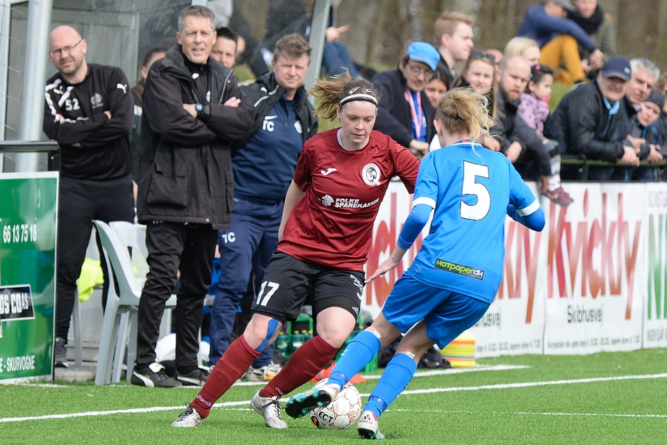 Værterne var hurtige til at svare igen, og lykkedes med at få rykket spillet længere frem på banen, og langt inde i første halvlegs overtid kom udligningen. Annika Hansen sendte en håbefuld ballonbold ind i feltet, og da gæsternes keeper stødte sammen med venner og fjender i sin jagt efter bolden, droppede den ned foran Cecilie Skov, som kastede sig ind i bolden og skabte balance i regnskabet.