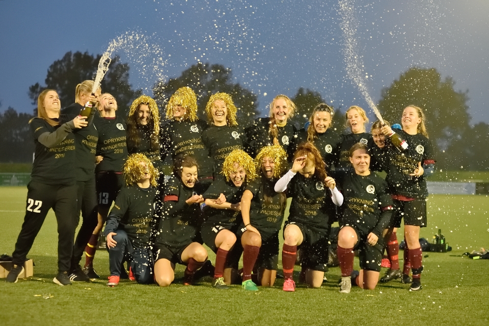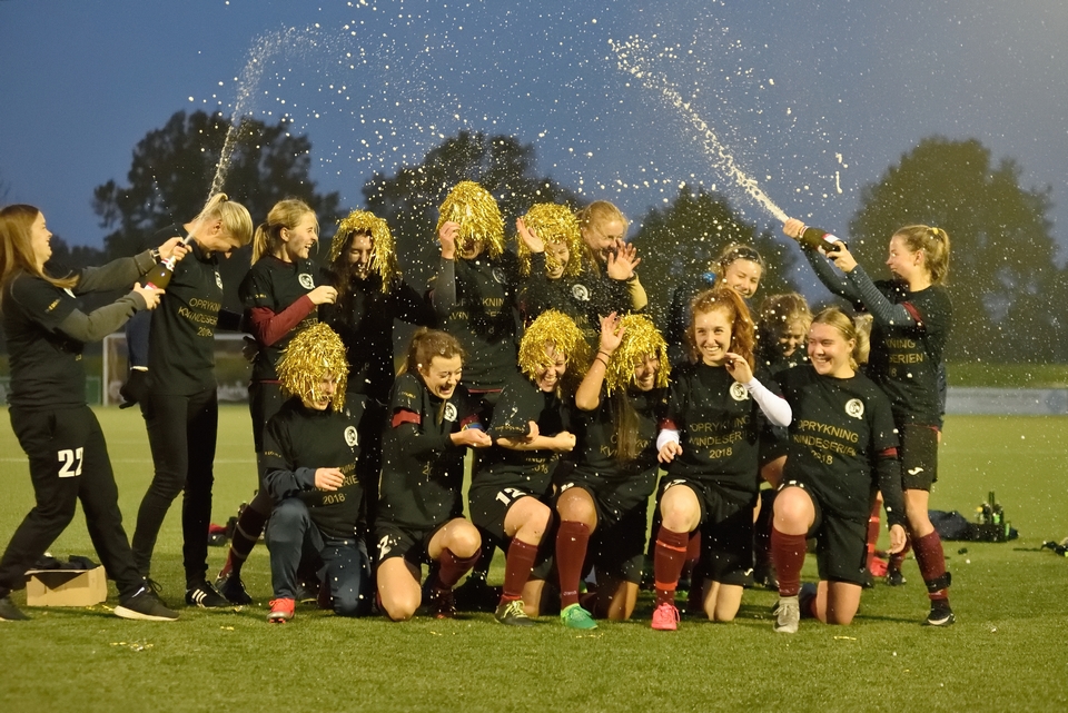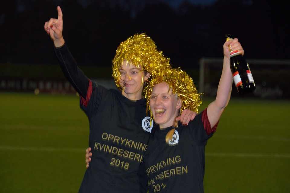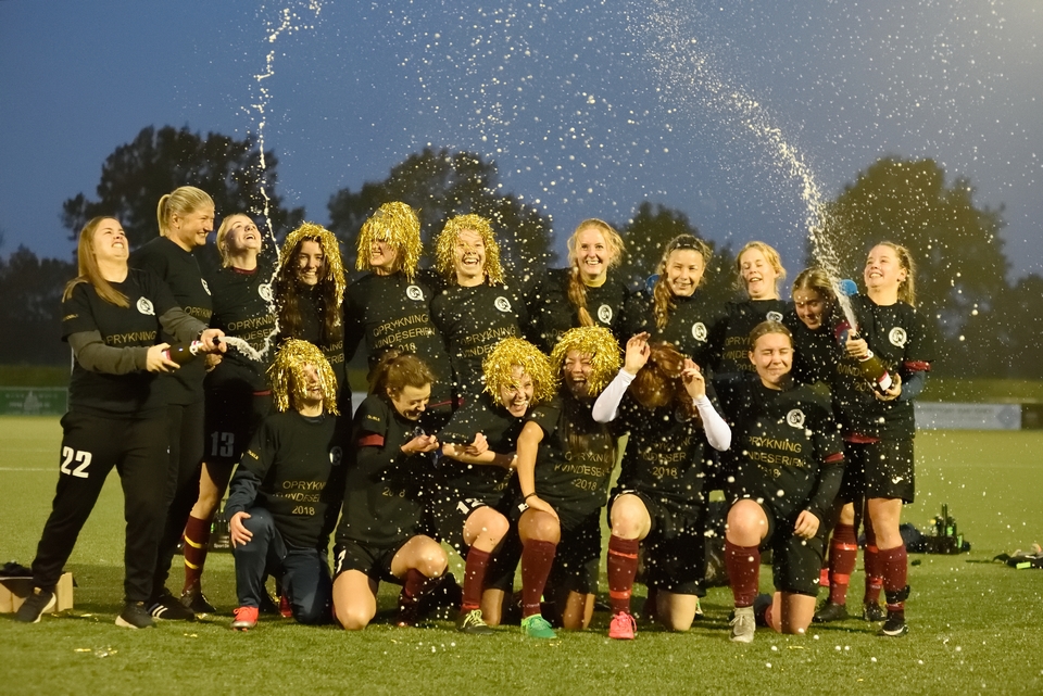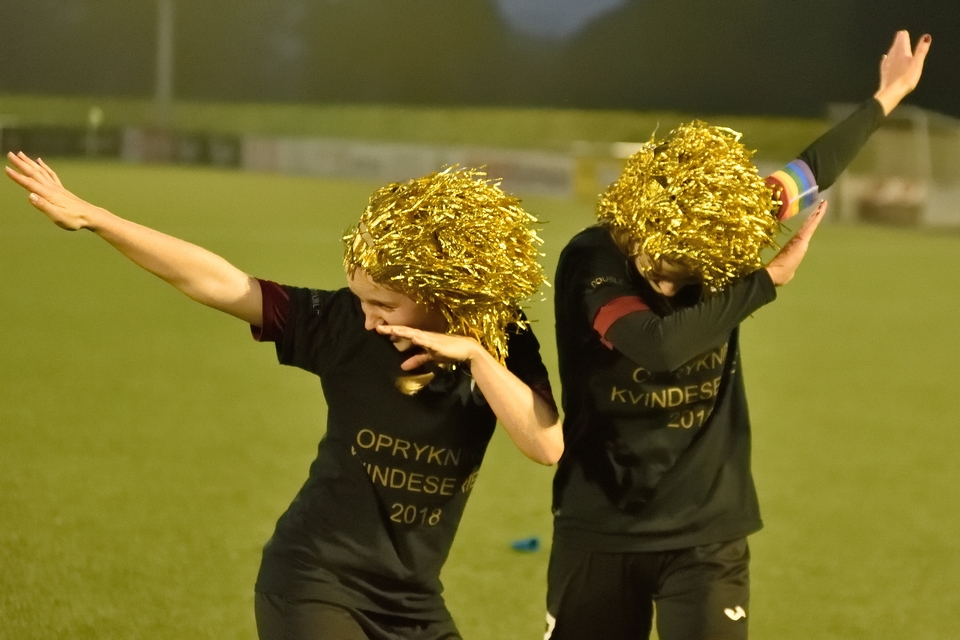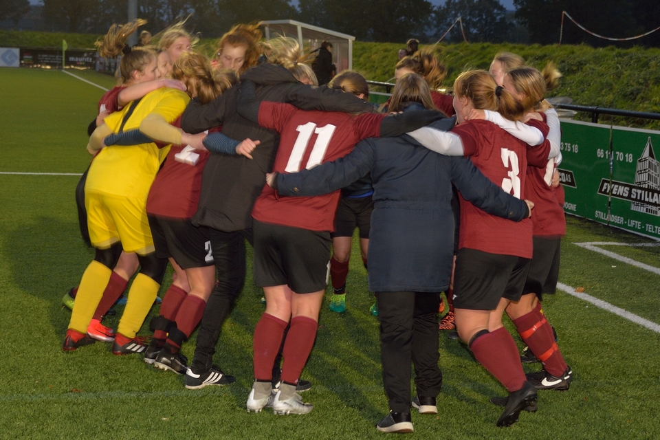 Efter kampen fejrede spillere og trænere det flotte efterår på behørig vis. Spillerne havde selv sat trumf på med guldparykker og T-shirts, der markerede den stilsikre oprykning til Kvindeserien. I den forbindelse skal der lyde en kæmpestor tak til Revisorgården Odense, som hjalp pigerne med at få lavet de flotte T-shirts. Se alle billederne fra kampen og den efterfølgende fejring i galleriet længere nede på siden.