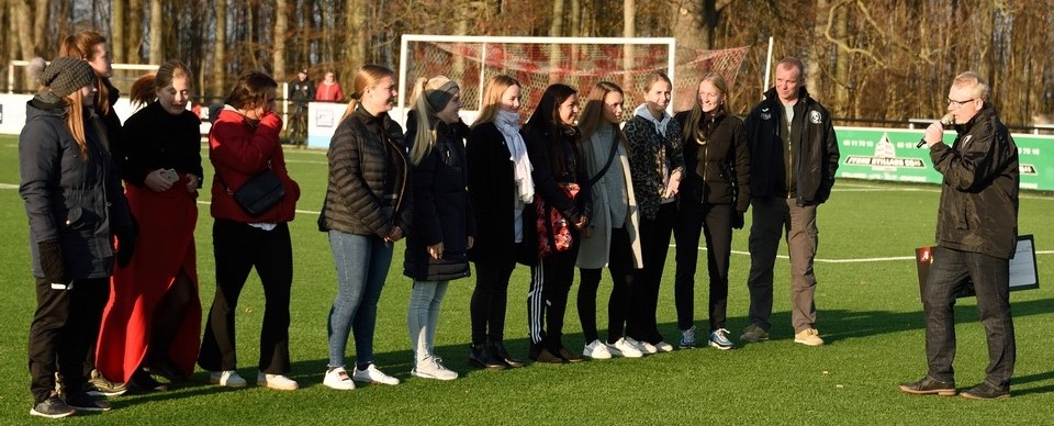 I pausen blev Odense Q's 2. hold hyldet for den suveræne oprykning til Kvindeserien under holdets nye cheftræner, Claus Bertelsen.