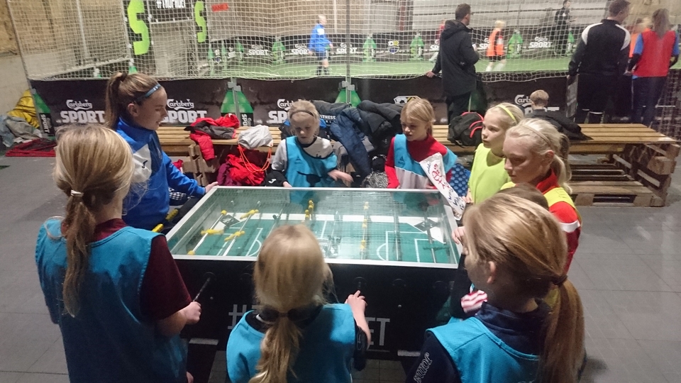 Kl. 16:55 falder lydniveauet i nogle sekunder, da 16 store piger — alle klædt i lyseblåt med Team Odense Q-logo på brystet — træder ind i hallen. Det er U18 DM, der har meldt deres ankomst — og de vil også lege med. De små finder straks de store piger, de allerede kender fra de træninger og events, som U18 DM-pigerne jævnligt deltager i. Holdene deles op med 5 små piger + 1-2 U18 DM spillere på hvert hold, og dermed er scenen sat for 2 timers god fodbold og udvikling af realtioner på tværs af klub og alder.